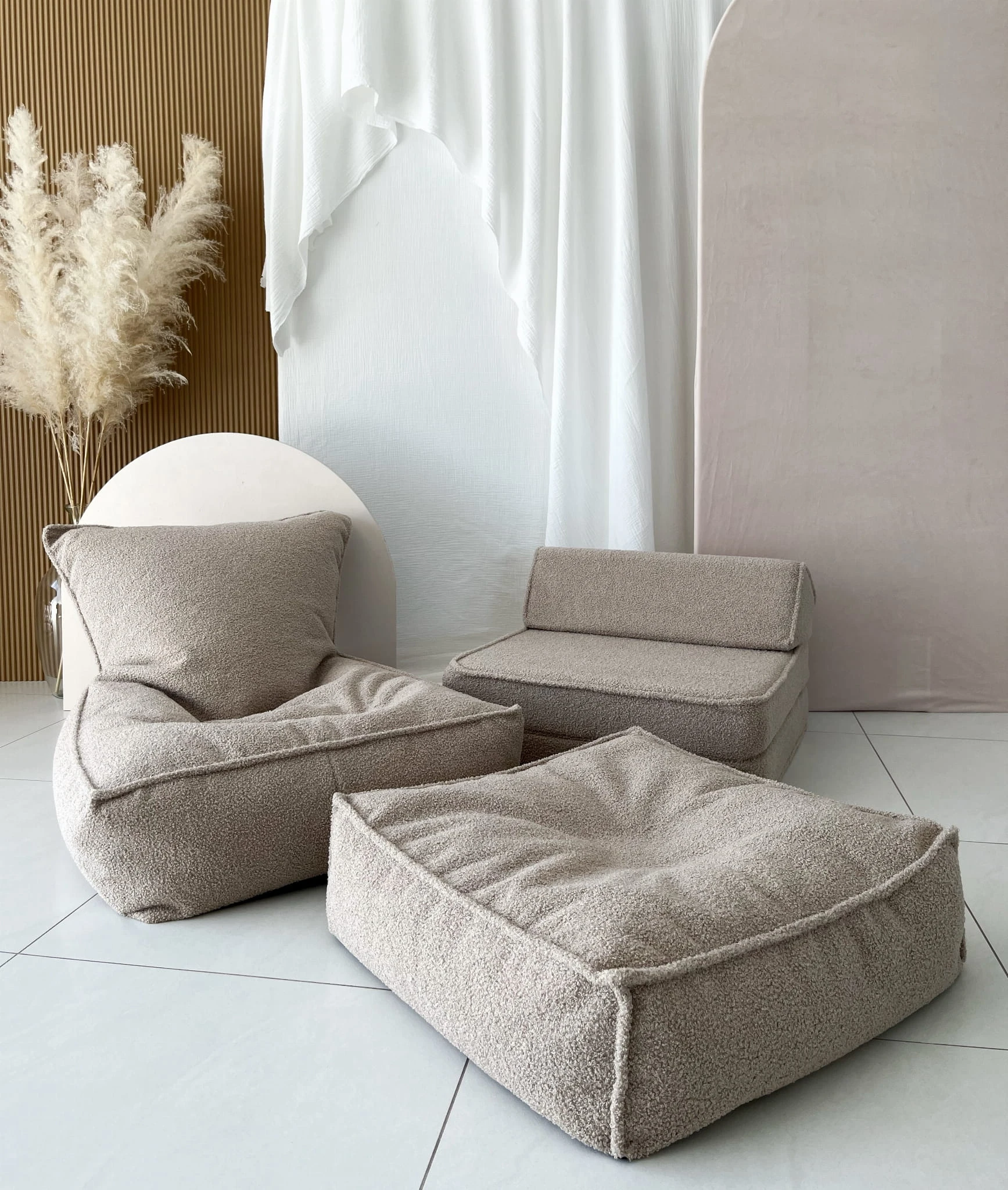 Piękne duże Pufy Worek dla dziecka z najmodniejszego w ostatnim czasie materiale BOUCLE.
